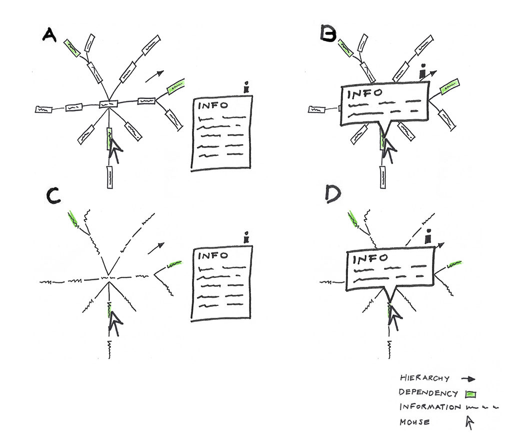 I’ve been researching possible options to represent software parts and how they depend on each other. The trade-off seems to be between supporting the reading flow, helping to grasp details quickly, or giving priority to the overview. Which visualization style would you pick?